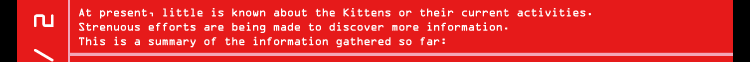 The Kittens placed semi nude pictures of each other on the Internet for money, not realising that the backgrounds of these same pictures gave The Albino the proof he needs that they are inherently evil creatures. A race developed between the two factions; the Kittens trying to destroy the evidence before The Albino can fully download them.
